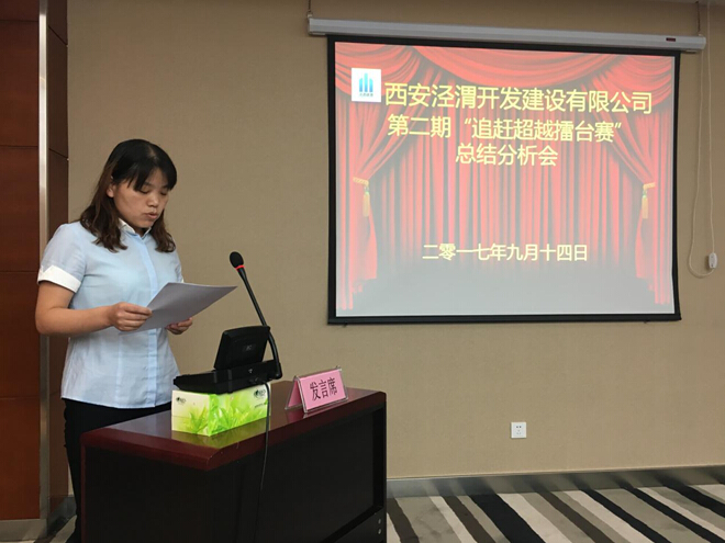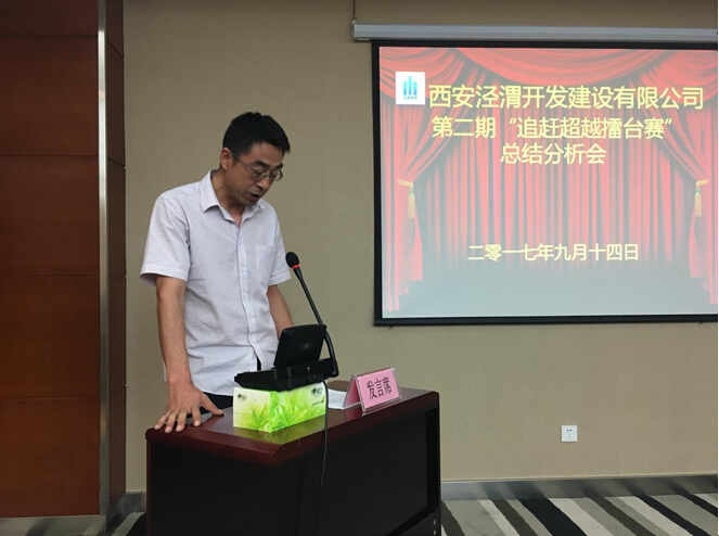 "或许我们还不够优秀,但我们努力向着优秀看齐,尽管我们很平庸,但我们踏实的走着每一步,我们定会不负领导厚望,加压奋进,携手创造属于我们泾渭建设公司的明天"8月份擂台赛优胜部门合同管理部负责人作交流发言时如是说。 9月14日上午,泾渭建设公司按照"一月一擂台"的宗旨,组织召开了第二期追赶超越擂台赛总结分析会,邀请集团领导苏建卫、米燕到会指导,公司全体员工参加会议。 会上,杨照伟董事长通报了公司各部门8月份月度考核结果,并对8月份工作完成情况进行总结、分析。优胜部门与后进部门负责人分别作交流发言,并就下一步追赶超越晒出了承诺。