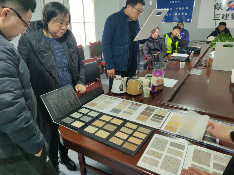 会议首先由施工单位就各方汇总的外立面及装修图纸疑问与设计院逐一进行沟通和答疑。接下来各方就施工单位提供的外立面真石漆及瓷砖的色板进行讨论,从用材的感官、质感、颜色、做法等多个角度进行探讨,同时充分参考校方意见,初步确定了真石漆及瓷砖各个部位的颜色范围。