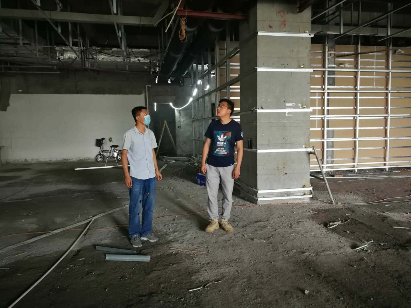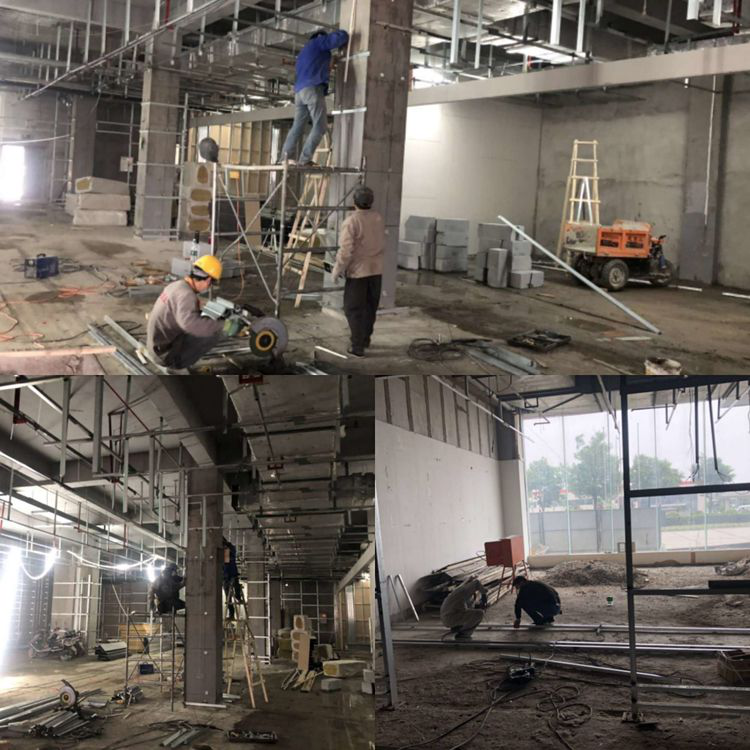 泾渭新城政务服务分中心装修改造项目顶面转换层施工、铺设线管并进行墙面骨架焊接。