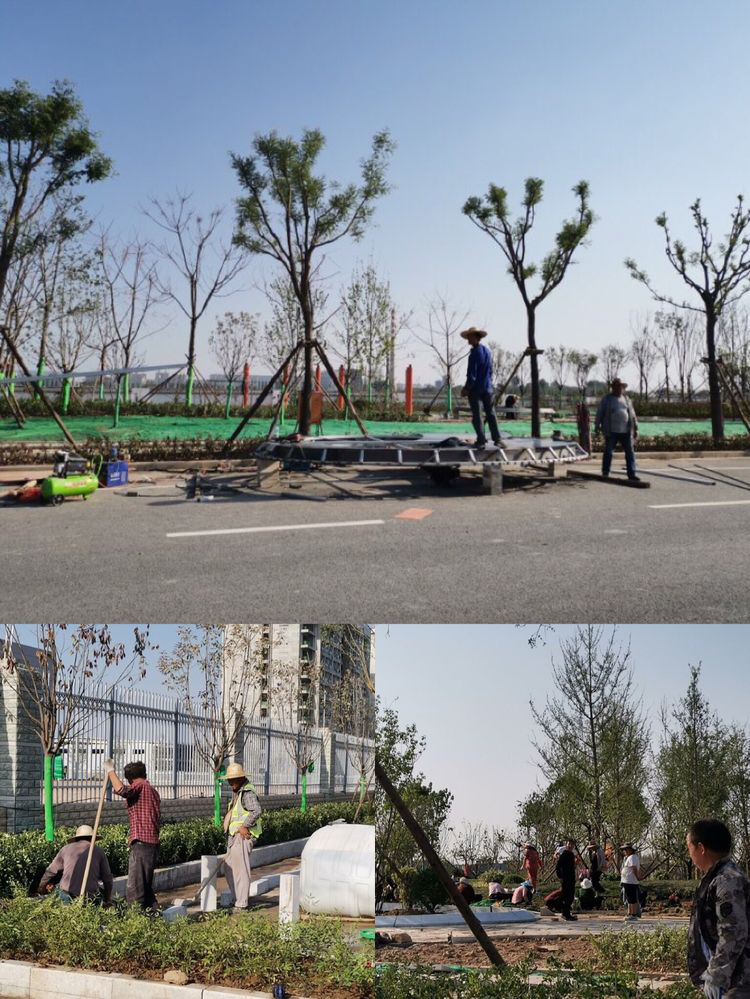 纬二路景观绿化项目北侧草皮栽植完成20%,卫生间钢构吊装50%,大门东草皮栽植完成。