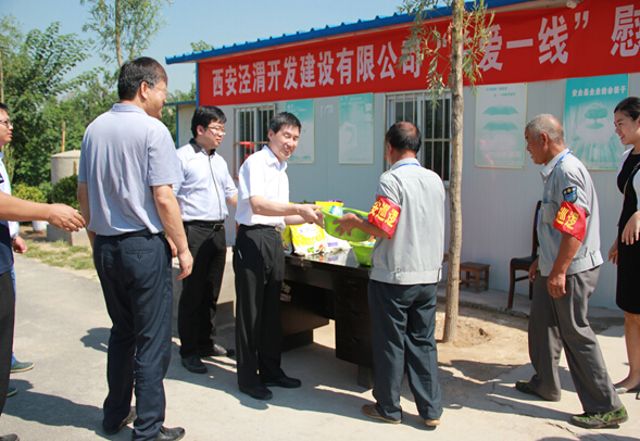 金秋送爽,碧空澄澈。9月1日上午,管委会副书记、副主任王伟、管委会副主任张哲,园区办各相关职能部门负责人及城建集团党委书记、总经理李凡、副总经理吴实康、总经理助理马赛亮,在泾渭建设公司相关人员的陪同下,深入泾渭幼儿园项目、泾河防洪后期维护项目现场,亲切慰问奋战在施工一线的人员,为他们送去月饼、矿泉水、凉茶、洗脸盆、毛巾、洗衣粉、香皂等物品,把管委会、城建集团的关怀与爱心,送到施工人员心间。
