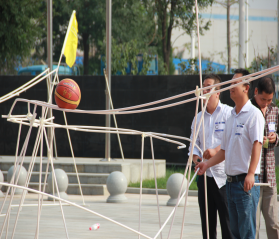 此次活动是根据“过山车”设计原理,利用大量专用管材,接头、篮球等器材,手锯、胶带等工具,分组设计有不同创意的过山车模型,成功实现过山车运转后,在最后的环节设计展示出企业文化或活动主题的巨幅画面。由此通过模拟过山车制作的全过程,让团队感受完成特殊任务的快乐,享受成功的喜悦,继而引发团队成员自我感悟,增强团队凝聚力,提高集体荣誉感。